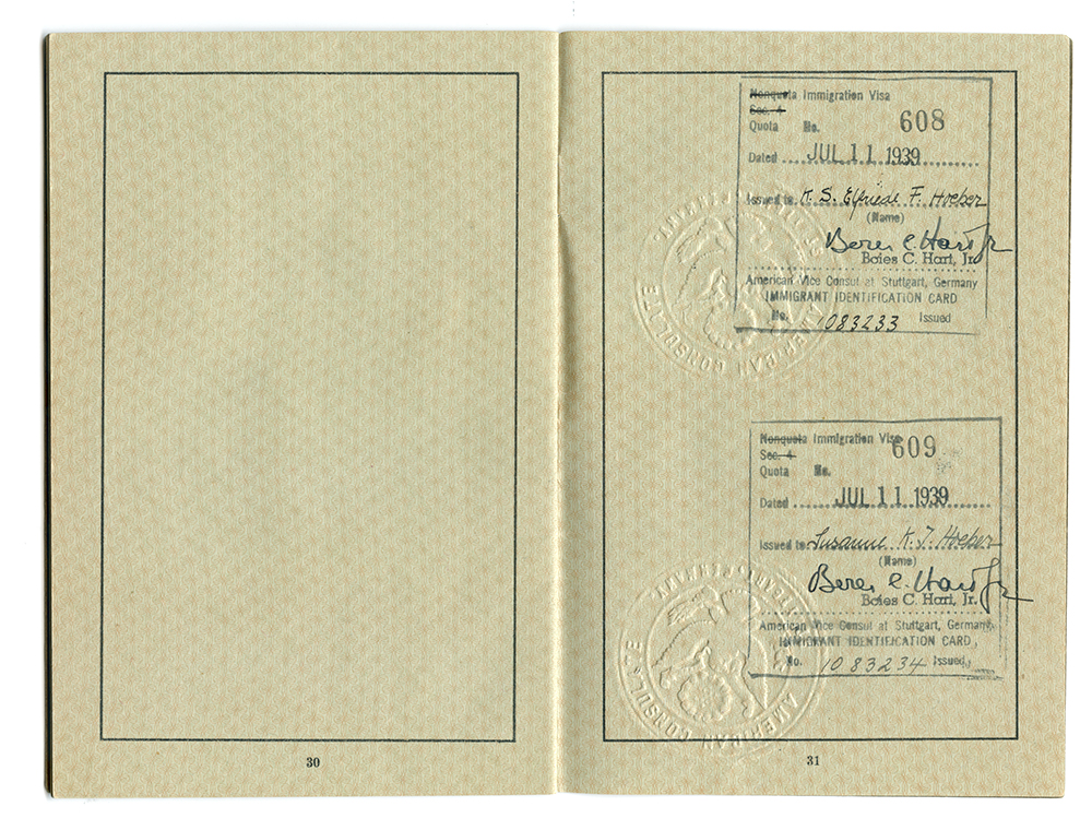 - Page in Elfriede’s passport showing the American immigration visas issued for her and Susanne in Stuttgart, July 12, 1939.