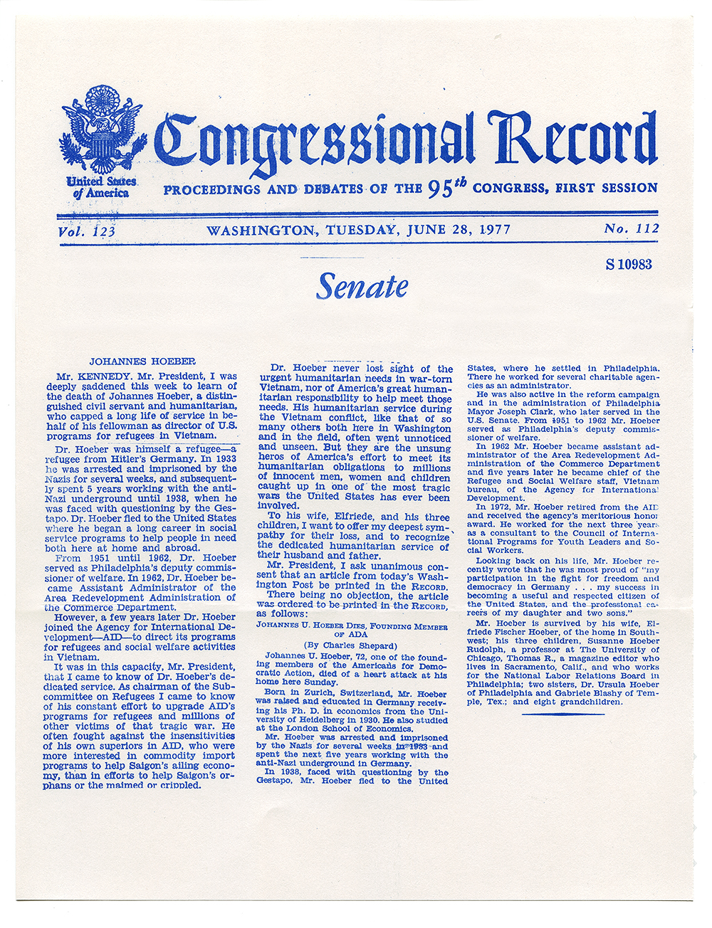 - Eulogy of Johannes Hoeber delivered by Senator Edward F. Kennedy, June 28, 1977.