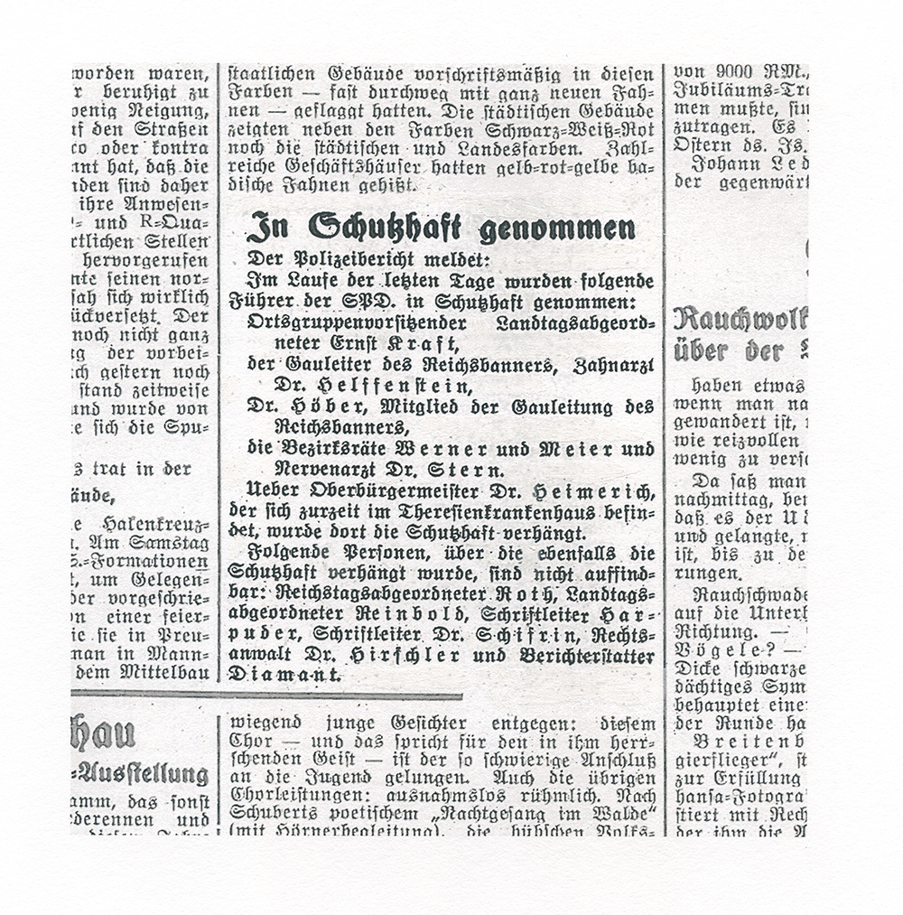 - Clipping from a Mannheim newspaper reporting that Johannes was placed in “protective custody” by the Nazis, March 1933. He was held with other Social Democrats in the city jail for five weeks, when he was released on condition that he leave the city and never return.